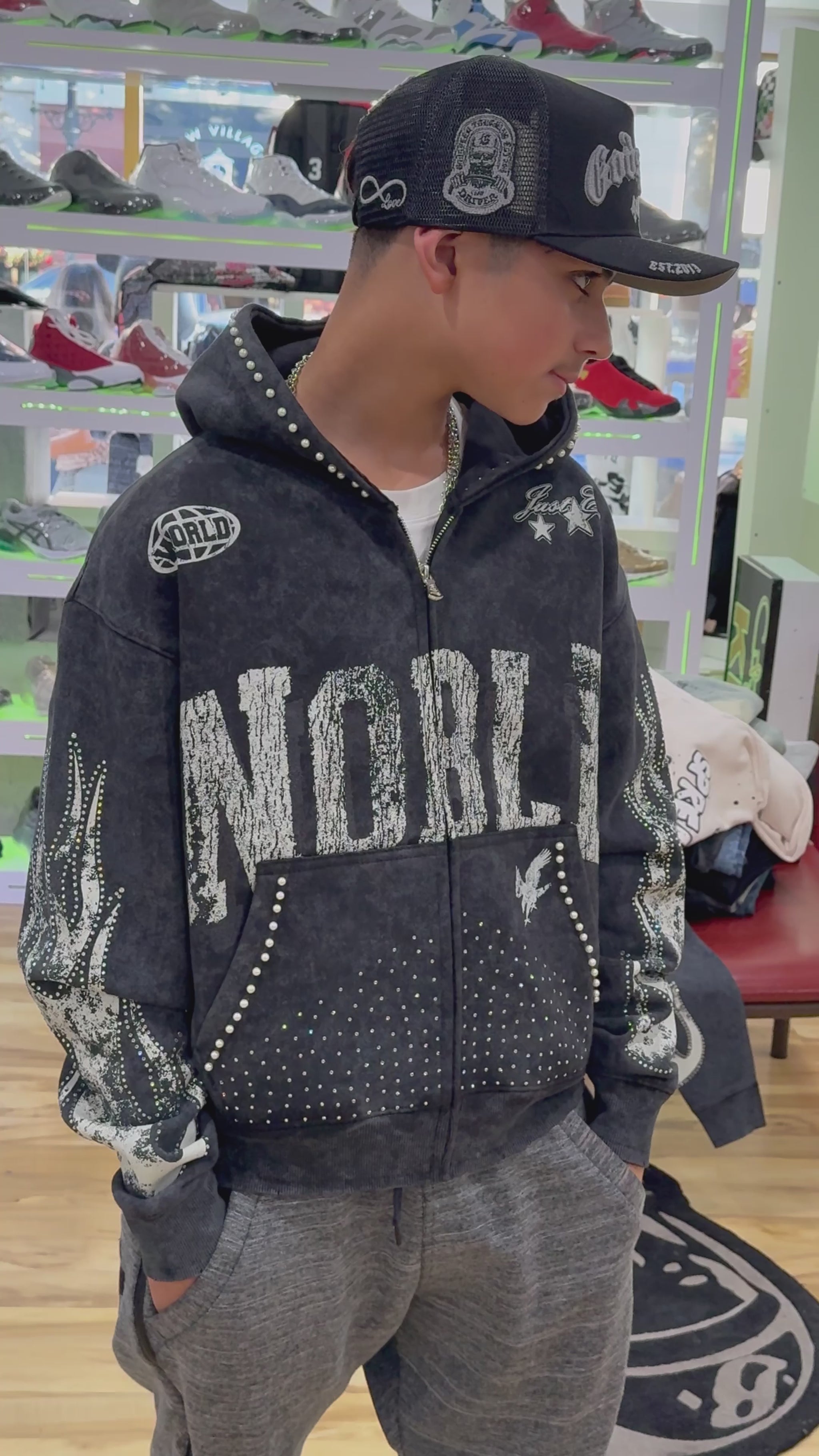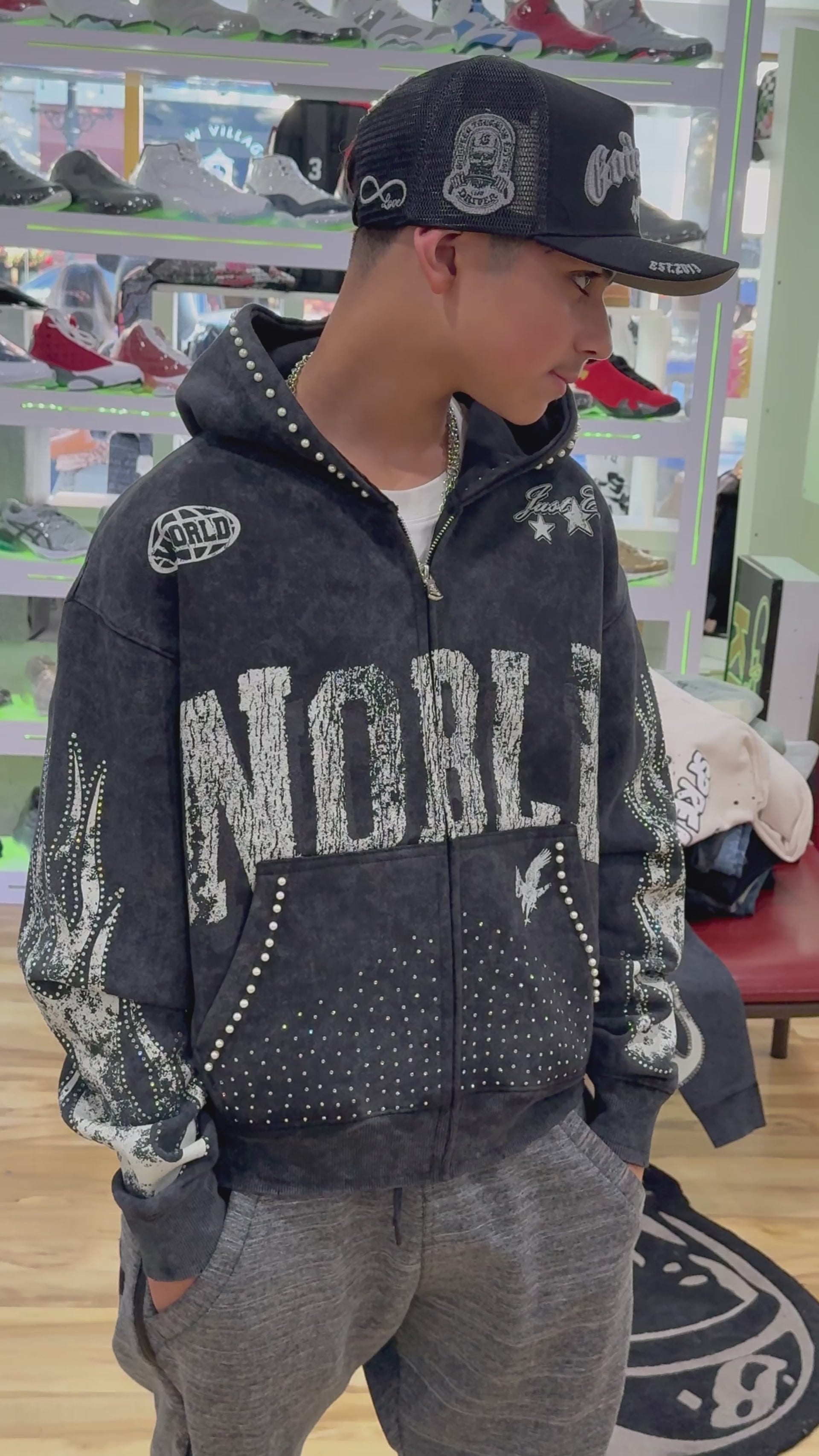 Elite premium denim blackwash rhinestone noble hoodie
