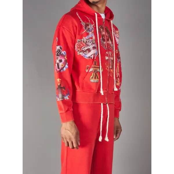 Make an unforgettable impression with the Politics Hoodie - Nivin in Jujube Red. Covered in vivid tattoo-inspired graphics, this bold zip-up piece channels streetwear energy through spiritual and symbolic artwork.