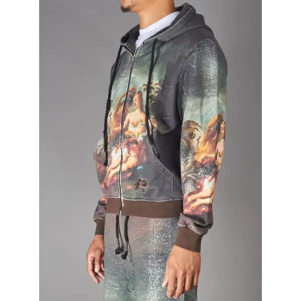 Make an unforgettable impression with the Politics Jacket - Worin in Beige Mix. This artistic full-zip hoodie showcases a vintage painting across the front and sleeves, blending renaissance elegance with modern streetwear flair.