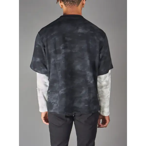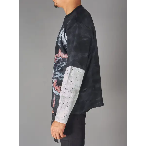Make an unforgettable impression with the Politics Shirt - Thorn - Black & Light Grey - 010. This layered long sleeve tee brings divine rebellion to the forefront with “HOLY SAINT” in rhinestone lettering and a fiery cherub duo front and center. The outer black tee features a vintage wash finish, while the light grey inner sleeves are dusted with rhinestone studs for added texture and contrast.